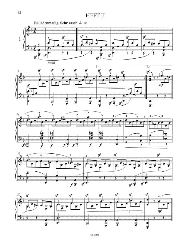 Schumanns Davidsbündlertänze Op. 6 entstanden im Jahre 1837. Der titelgebende Davidsbund, benannt nach dem Schutzpatron der Musik, dem biblischen Philisterschreck und königlichen Sänger, ist als romantisch-literarische Inszenierung aufzufassen, bei der ebenso dichterische Vorbilder wie wirklich künstlerische oder politische Verbindungen der Vormärzzeit Pate gestanden haben. Die Davidsbündlertänze sind ein Zyklus von zweimal neun Stücken, in denen die Traditionen der Suite und des Variationszyklus fortwirken. Die Ausgabe beruht auf der von Schumann selbst redigierten Zweitauflage, wobei musikalisch bedeutsame Abweichungen der Erstfassung zusätzlich im Kleinstich abgedruckt sind.