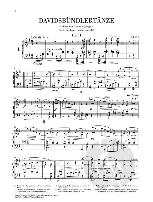 Nur in Schumanns Vorstellungswelt existierte der 'Davidsbund' - eine Gruppe von Künstlern, die sich im revolutionären Kampf gegen rückständige Strukturen in der Kunstwelt zusammengetan hatte, und der er lebende und imaginäre Mitglieder zurechnete. Die Erstausgabe seiner 'Davidstänze' veröffentlichte Schumann unter dem Pseudonym 'Florestan und Eusebius' - jenen beiden Gestalten aus dem Davidsbund, in denen er seine ungestüm-sanfte Doppelnatur verkörpert fand. Auch Clara Wieck, um deren Hand er während der Entstehung mehrmals vergeblich anhielt, gehörte dazu; ihr hat er die Tänze 'mehr wie irgend etwas' gewidmet. Die kurzen, höchst unterschiedlichen Stimmungsbilder geben einen intimen Einblick in die Gefühlswelt Schumanns in jenen Tagen.