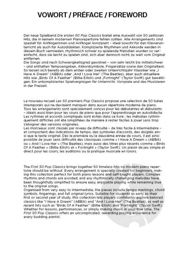 Der neue Spielband Die ersten 50 Pop Classics bietet eine Auswahl von 50 zeitlosen Hits, die in keinem modernen Pianorepertoire fehlen sollten. Alle Arrangements sind speziell für Anfängerinnen und Anfänger konzipiert – ideal sowohl für den Klavierunterricht als auch für Autodidakten. Komplizierte Rhythmen und Akkorde werden in diesem Buch vermieden, rhythmisch schwer zu spielende Melodien wurden so vereinfacht, dass sie leicht zu spielen sind, sich aber dennoch nicht zu weit vom Original entfernen. Die Songs sind nach Schwierigkeitsgrad geordnet – von sehr leicht bis mittelschwer – und enthalten Tempoangaben, Akkordsymbole, Fingersätze sowie den Originaltext. So lassen sich bereits ab dem ersten oder zweiten Unterrichtsjahr Klassiker wie "I Have A Dream" (ABBA) oder "And I Love Her" (The Beatles), aber auch aktuellere Hits wie "Birds Of A Feather" (Billie Eilish) und "Fortnight" (Taylor Swift) gut bewältigen. Ein unkompliziertes Spielvergnügen für Unterricht, Vorspiele und das Musizieren in der Freizeit.