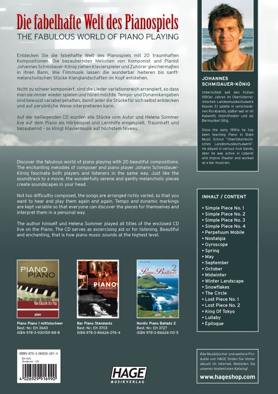 Entdecken Sie die fabelhafte Welt des Pianospiels mit 20 traumhaften Kompositionen. Die bezaubernden Melodien von Komponist und Pianist Johannes Schmidauer-König ziehen Klavierspieler und Zuhörer gleichermaßen in ihren Bann. Wie Filmmusik lassen die wunderbar heiteren bis sanft-melancholischen Stücke Klanglandschaften im Kopf entstehen.