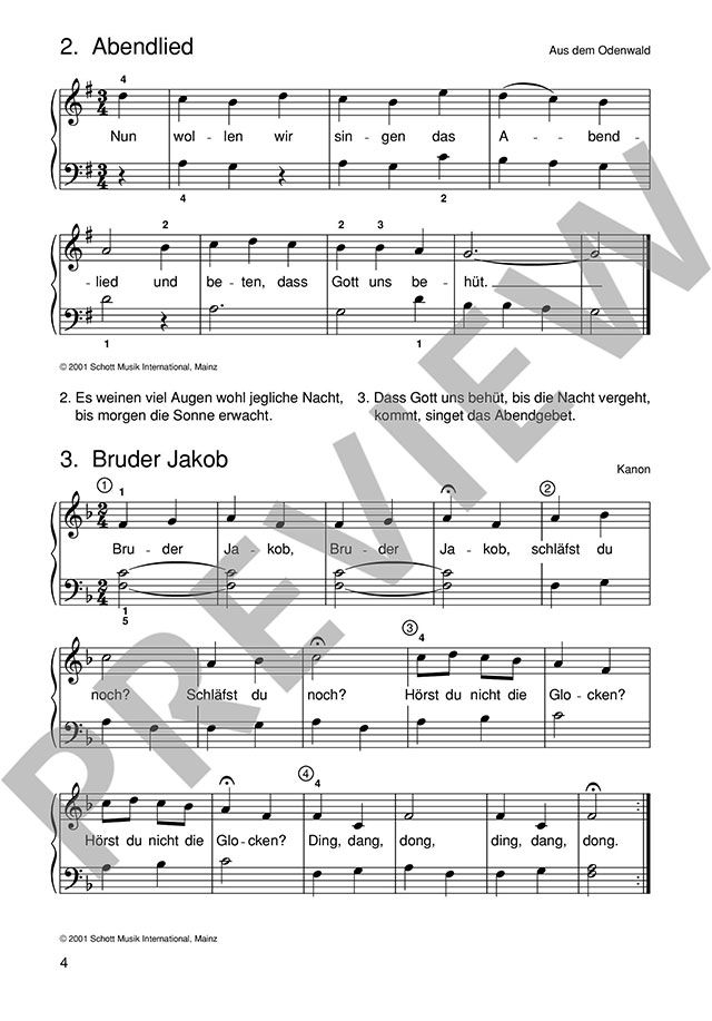 Die Hefte enthalten 31 sehr leichte Bearbeitungen für Klavier, die schon ab dem ersten Unterrichtsjahr gespielt werden können. Bei der Ausgabe mit CD ist jedes Lied in zwei Versionen eingespielt: sowohl mit als auch ohne Klavier. Bei beiden Fassungen können die Kinder selbst mitspielen.