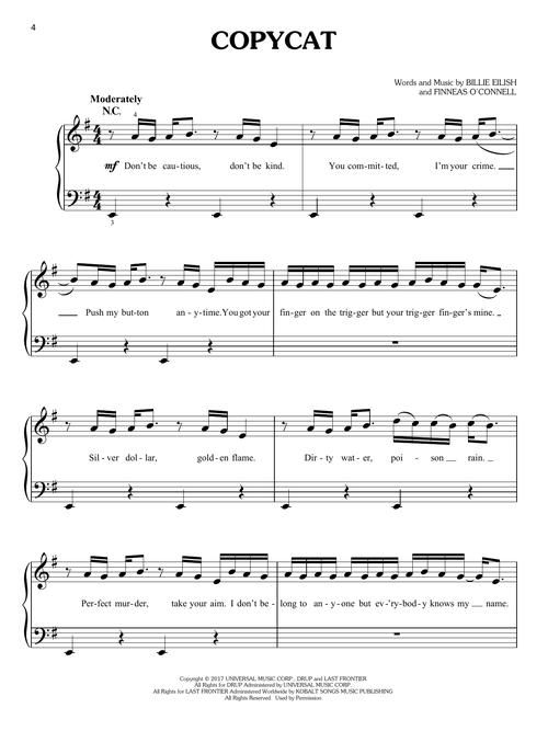 This songbook features easy piano arrangements with lyrics for all the tracks on her attention-grabbing debut EP featuring: Bellyache - Copycat - Hostage - Idontwannabeyouanymore - My Boy - Ocean Eyes - Party Favor - Watch plus &burn and Lovely.