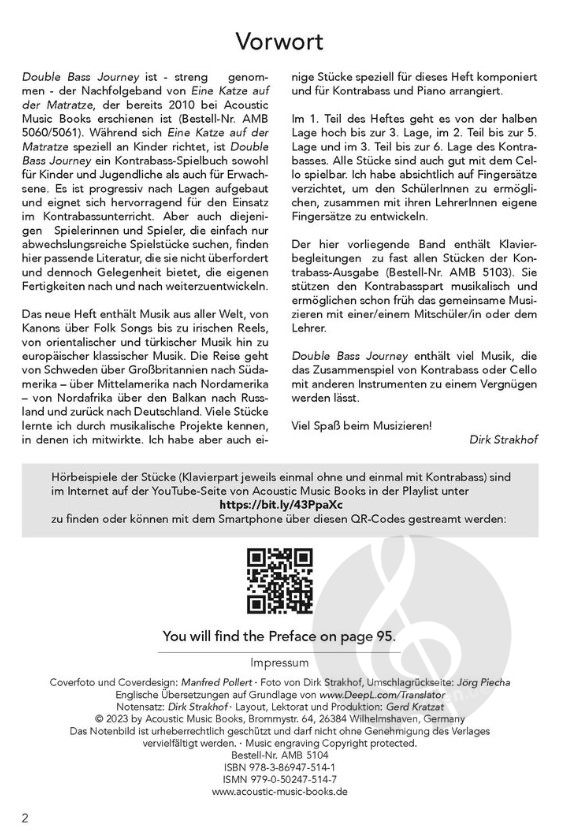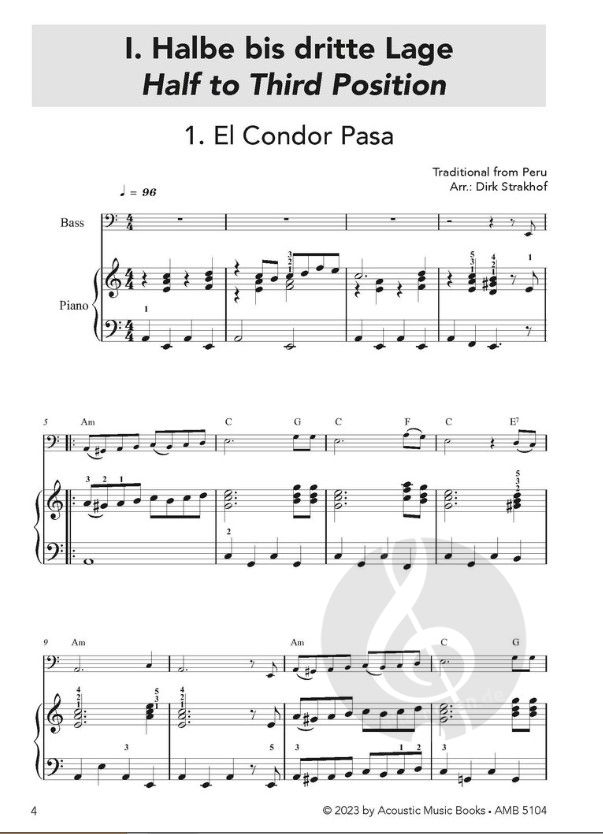 Die Ausgabe enthält Klavierbegleitungen zu fast allen Melodien und Themen der Kontrabass-Stimme (Bestell-Nr. AMB 5103). Der Kontrabasspart wird dadurch musikalisch gestützt und die Spielerin/der Spieler übt intuitiv das Hören auf den Musizierpartner. Der gemäßigte Schwierigkeitsgrad macht es Lehrern/innen oder Mitschülern/innen leicht, gemeinsam zu musizieren.
