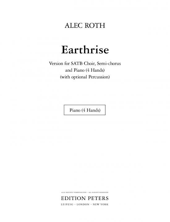 Earthrise ist ein 25-minütiges Werk von Alec Roth. Inspiriert ist es von dem bekannten Foto der Erde, das 1968 im Rahmen der NASA-Mission Apollo 8 entstand, sowie von dessen Bedeutung für damals aufkommende Umweltbewegung. Die vorliegende Fassung ist für gemischten Chor, Halbchor und Klavier zu vier Händen mit optionalem Schlagzeug. Die textliche Grundlage für das auf Latein gesungene Earthrise bildet Jesajas Beschreibung des göttlichen Blickes auf die Erde. Ergänzt wird sie durch visionäre Texte aus anderen Quellen. Die 40-stimmige Ursprungsfassung von Earthrise entstand als Auftragswerk von Ex Cathedra zum 40. Geburtstag des Ensembles im Jahr 2009. Die Uraufführung sang Ex Cathedra unter Leitung von Jeffrey Skidmore am 31. Januar 2010 in der Birmingham Town Hall. Die Uraufführung der vorliegenden Fassung fand am 7. August 2015 im Großen Saal im britischen Dartington statt. Aufführende waren der Dartington International Summer School Choir mit Mitgliedern von Ex Cathedra (Halbchor) sowie Joanna MacGregor und Gavin Roberts (Klavier) unter Leitung von Jeffrey Skidmore. Die vorliegende Ausgabe ist die vierhändige Klavierstimme (EP73224b) zur Fassung für gemischten Chor, Halbchor und Klavier zu vier Händen. Klavierauszug (EP73224), Dirigierpartitur (EP73224f) und optionale Schlagzeugstimme (EP73224g) sind separat erhältlich.