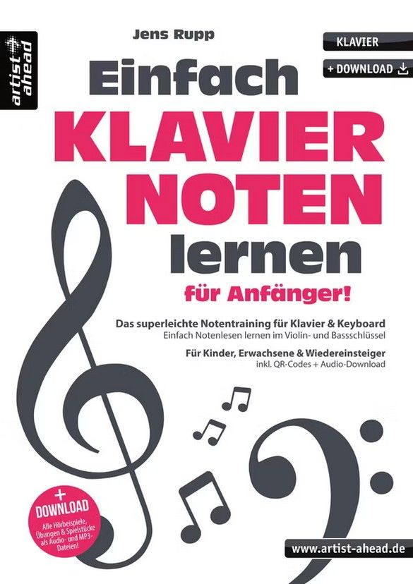 Mit "Einfach Klaviernoten lernen für Anfänger" präsentiert Jens Rupp eine Notenschule, die sich an Kinder ab 8 Jahren, Erwachsene und Wiedereinsteiger richtet. Sie stellt eine wertvolle Ergänzung zu gängigen Klavierschulen dar und ermöglicht einen superleichten Einstieg in die Welt der Klaviernoten und die Kunst des Notenlesens. Zu Beginn fällt es vielen Lernenden schwer, Noten zu lesen, da mit Tasteninstrumenten in zwei verschiedenen "Notenschlüsseln" gespielt wird. Um die Noten des Violin- und des Bassschlüssels "gleichzeitig" zu erlernen, braucht es Zeit, Geduld und Übung. Aus diesem Grund ist es wichtig, sich immer wieder bewusst mit den Noten zu befassen und sie mit Hilfe dieser Notenschule motiviert und mit Freude kennenzulernen.