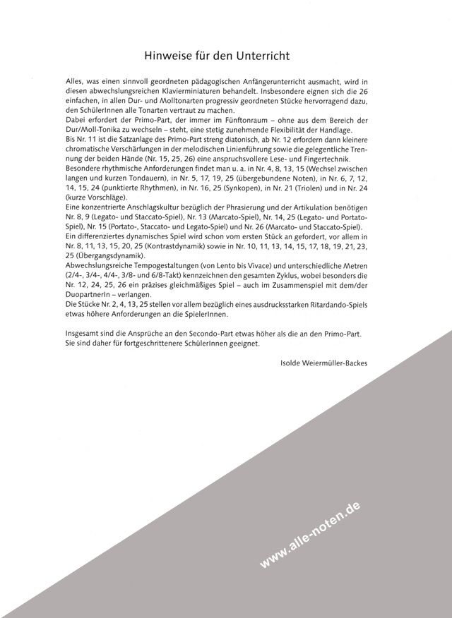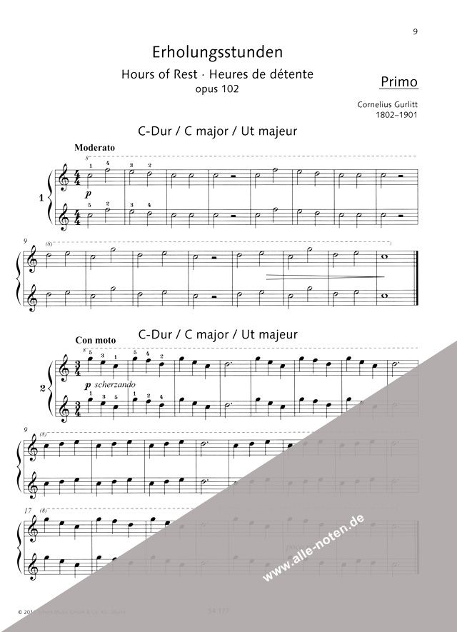 Die Beliebtheit von Cornelius Gurlitts (1820-1901) vielseitigem und reichhaltigem Klavierwerk, sicherlich angeregt durch seine Tätigkeit als Musiklehrer, ist bis heute ungebrochen und hat weiterhin eine große pädagogische Bedeutung im Unterricht. Seine vierhändigen Klavierminiaturen sind in ihrer musikalischen Sprache den Kompositionen von Carl Reinecke und Theodor Kirchner sehr ähnlich. Die Erholungsstunden erschienen erstmalig 1880 bei Schott und sollen durch diese Neuauflage für den Unterricht wieder neu erschlossen werden. Die Miniaturen haben eine einfache, aber wirkungsvolle Satzanlage, eine pädagogisch sinnvoll geordnete Zusammenstellung und eine ausdrucksstarke Klangsprache, die cantable, volksliedhafte, tänzerische, expressive und choralartige Elemente enthält. Alles, was einen sinnvoll geordneten pädagogischen Anfängerunterricht ausmacht, wird in diesen 26 abwechslungsreichen Miniaturen behandelt, insbesondere werden die Schüler mit allen Dur- und Molltonarten vertraut. Der Primo-Part steht - wie bei Diabellis 'Melodischen Übungsstücken' - im Fünftonraum und ist somit ideal für Anfänger geeignet, die Ansprüche an den Secondo-Part sind etwas höher. Eine wertvolle Bereicherung des vierhändigen Repertoires.