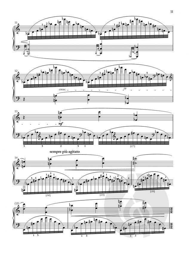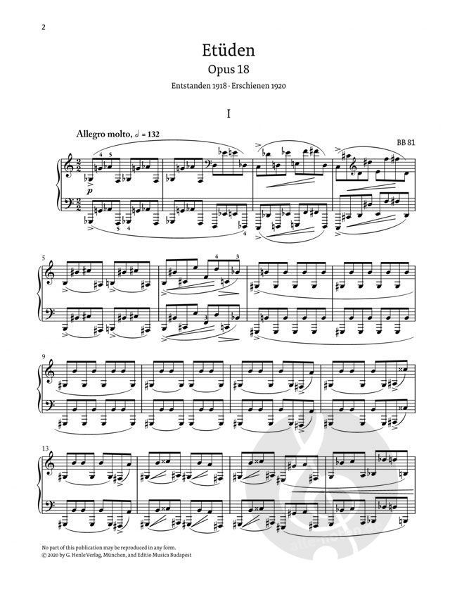 Mit diesen drei Etüden wollte Bartók 1918 ganz gezielt einen Beitrag zur Neuen Musik leisten. Die erste Etüde ist eine Art Super-Allegro barbaro mit motorischer Vehemenz, die zweite erscheint mit ihren perlenden Klangkaskaden wie eine von Claude Debussy inspirierte Elegie. Die dritte hingegen lässt Arnold Schönbergs Einfluss erkennen. Dessen 'Musikalische Privataufführungen' in Wien gehörten auch zu den wenigen Gelegenheiten, bei denen dieser - für Ausführenden wie Zuhörer - höchst anspruchsvolle Zyklus Bartóks in den 20er-Jahren gleich mehrfach aufgeführt wurde. Die erste Auflage der 1918 bei der Universal Edition in Wien erschienenen Erstausgabe war so schnell vergriffen, dass bereits 1921 eine zweite erschien. László Somfais Urtextausgabe beruht auf dem Notentext der Bartók-Gesamtausgabe und liefert neben einem spannenden Vorwort zur Entstehung auch interessante aufführungspraktische Hinweise.