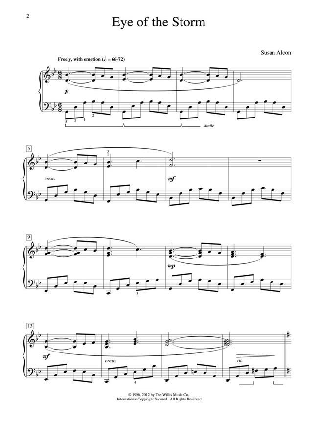 The memorable melody of Eye of the Storm is wistful, which is slightly surprising, yet strong. The storm is in the left hand, represented by whirling non-stop arpeggios. A beautiful recital solo. Key: G Minor (with modulations to the relative major).