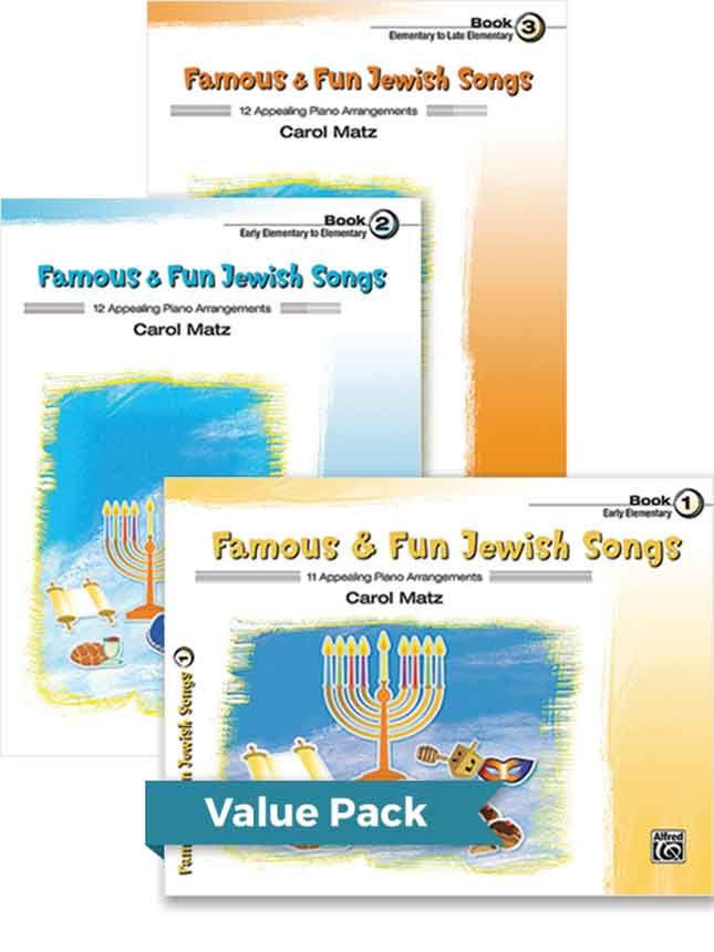 Carol Matz's Famous & Fun Jewish Songs books are filled with well-known, beloved Hebrew melodies. The collection contains songs for various Jewish holidays, Israeli, and Yiddish folk songs, as well as treasured traditional pieces. The arrangements can be used to supplement any method. This Value Pack contains Books 1-3.