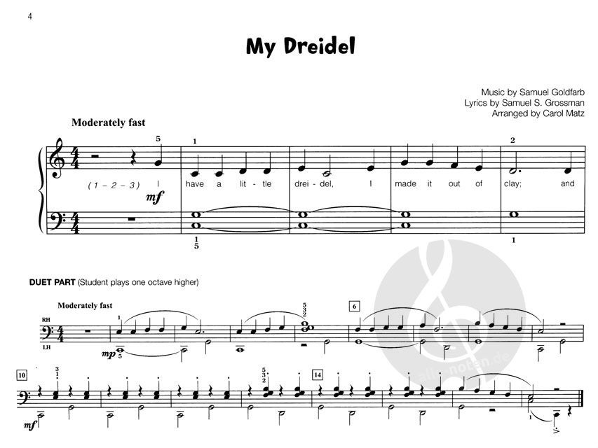 Carol Matz's Famous & Fun Jewish Songs, Book 1 is filled with well-known, beloved Hebrew melodies. The collection contains songs for various Jewish holidays, Israeli, and Yiddish folk songs, as well as treasured traditional pieces. The arrangements can be used to supplement any method and have optional duet parts for teacher or parent.