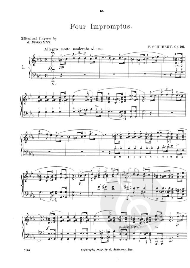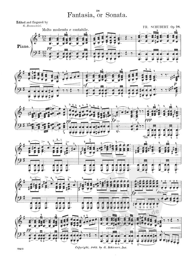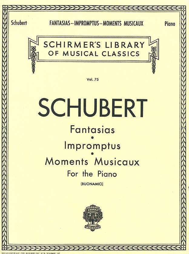 Contents: Impromptu in C minor, Op. 90, No. 1 - Impromptu in E-flat Major, Op. 90, No. 2 - Impromptu in G-flat Major, Op. 90, No. 3 - Impromptu in A-flat Major, Op. 90, No. 4 - Impromptu in F minor, Op. 142, No. 1 - Impromptu inA-flat Major, Op. 142, No. 2 - Impromptu in B-flat Major, Op. 142, No. 3 - Impromptu in F minor, Op. 142, No. 4 - Moment Musical in C Major, Op. 94, No. 1 - Moment Musical in A-flat Major, Op. 94, No. 2 - Moment Musical in Fminor, Op. 94, No. 3 - Moment Musical in C-sharp minor, Op. 94, No. 4 - Moment Musical in F minor, Op. 94, No. 5 - Moment Musical in A-flat Major, Op. 94, No. 6 - Fantasia in C Major, Op. 15 - Piano Sonata No. 18, Op. 78