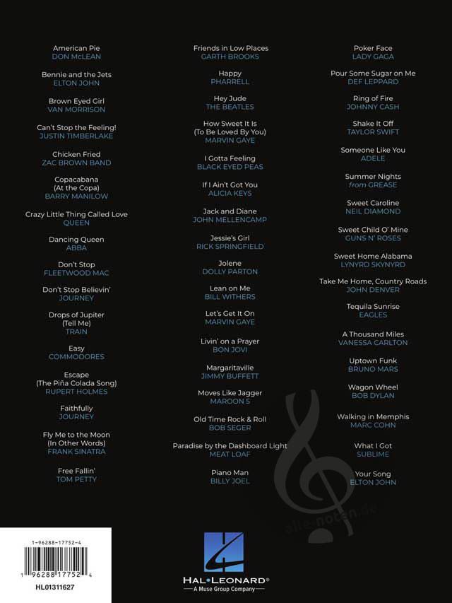 Perfekt für Pianist:innen, die gerade erst anfangen, Konzerte zu geben, bietet First 50 Bar Songs You Should Play on the Piano 50 Pop-Hits, die für leichtes Klavierspiel arrangiert wurden und von vielen Pianobar-Gästen gewünscht werden. Fügen Sie diese unverzichtbare Sammlung noch heute Ihrer Bibliothek hinzu, um sicherzustellen, dass Sie die Publikumslieblinge für jeden Auftritt parat haben! Die Lieder umfassen: American Pie - Can't Stop the Feeling - Chicken Fried - Don't Stop Believin' - Easy - Free Fallin' - Friends in Low Places - If I Ain't Got You - Jack and Diane - Lean on Me - Piano Man - Poker Face - Shake It Off - Sweet Home Alabama - Take Me Home, Country Roads - Uptown Funk - What I Got - Your Song - und mehr.