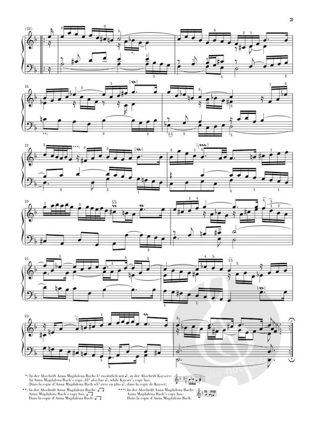 Bachs Französische Suiten zählen zu seinen beliebtesten Klavierwerken und werden auch sehr gerne im Unterricht eingesetzt. Dies war schon zur Zeit ihrer Entstehung der Fall, so dass wir heute eine kaum überschaubare Zahl an Abschriften aus Bachs Schülerkreis kennen, die viele vermutlich authentische Varianten überliefern. Der Herausgeber Ullrich Scheideler stellt die komplizierte Quellenlage in dieser revidierten Henle-Urtextausgabe in mustergültiger Klarheit dar. Die Suite I d-moll BWV 812 ist dem Gesamtband HN593 entnommen und eignet sich als handliche und günstige Einzelausgabe vorzüglich für den Unterricht. Dazu trägt nicht nur der hilfreiche Fingersatz von Michael Schneidt, sondern auch der Umgang mit den Ornamenten bei: Aus den Abschriften werden zusätzliche Zeichen in den Notentext übernommen und das Vorwort erläutert die Ausführung, so dass diese Urtextausgabe zugleich eine ausgezeichnete Einführung in die barocke Verzierungspraxis bietet. Ein weiterer Pluspunkt der Ausgabe: Interessante Abweichungen der verschiedenen Quellen sind leicht zugänglich in Fußnoten wiedergegeben. Summa summarum: Ein idealer Einstieg in die Bach'sche Suitenwelt!