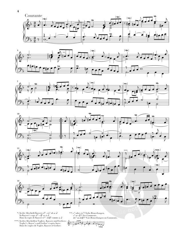 Bachs Französische Suiten zählen zu seinen beliebtesten Klavierwerken und werden auch sehr gerne im Unterricht eingesetzt. Dies war schon zur Zeit ihrer Entstehung der Fall, so dass wir heute eine kaum überschaubare Zahl an Abschriften aus Bachs Schülerkreis kennen, die viele vermutlich authentische Varianten überliefern. Der Herausgeber Ullrich Scheideler stellt die komplizierte Quellenlage in dieser revidierten Henle-Urtextausgabe in mustergültiger Klarheit dar. Die Suite I d-moll BWV 812 ist dem Gesamtband HN593 entnommen und eignet sich als handliche und günstige Einzelausgabe vorzüglich für den Unterricht. Dazu trägt nicht nur der hilfreiche Fingersatz von Michael Schneidt, sondern auch der Umgang mit den Ornamenten bei: Aus den Abschriften werden zusätzliche Zeichen in den Notentext übernommen und das Vorwort erläutert die Ausführung, so dass diese Urtextausgabe zugleich eine ausgezeichnete Einführung in die barocke Verzierungspraxis bietet. Ein weiterer Pluspunkt der Ausgabe: Interessante Abweichungen der verschiedenen Quellen sind leicht zugänglich in Fußnoten wiedergegeben. Summa summarum: Ein idealer Einstieg in die Bach'sche Suitenwelt!