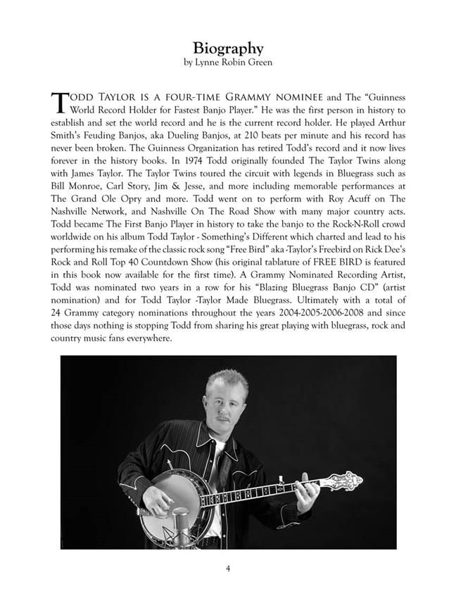Centerstream Publishing is proud to present Todd Taylor's incredible arrangements in notes & banjo tab of classics including: Dust in the Wind - El Cumbachero - Freebird - How Great Thou Art - I Can't Stop Loving You - Norwegian Wood - Rocket Man - Wayfaring Stranger - Yakety Sax - and more, plus some of Todd's terrific originals. The book includes a bonus CD of Todd's masterful playing on six searing tracks. An absolute must for all banjo players!