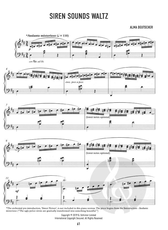 This is the first publication to feature the piano music of young English composer and pianist Alma Deutscher, complementing her recorded album on Sony Classical. Critics describe her work as 'indeed miraculous, ' having 'the poetry of Franz Schubert... the grace, lightness and brilliance of Mozart, ' and 'wit and spirit. ' CONTENTS: For Antonia - The Lonely Pine-Tree - Summer in Mondsee - Up in the Sky - When the Day Falls into Darkness - The Star of Hope - In Memoriam - The Chase - Sixty Minutes Polka - I Think of You (G-flat major and G major versions) - Siren Sounds Waltz