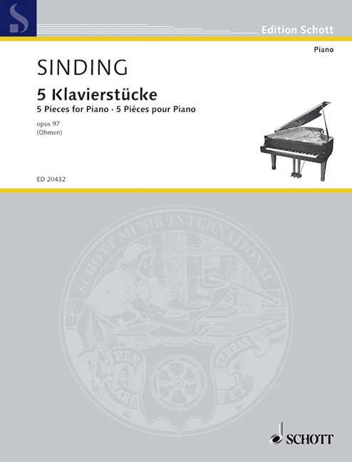 Christian Sinding (1856-1941) erlangte Weltruhm mit seinem Klavierstück 'Frühlingsrauschen', das auch heute noch sein bekanntestes Werk sein dürfte. Die 'Fünf Klavierstücke' op. 97 entstanden im Jahre 1909. Es sind Bravourstücke, deren spätromantische Harmonik bisweilen an Richard Strauss erinnert. Der wirkungsvolle, brillante Klaviersatz zeichnet sich durch eine weit ausgesponnene Melodik aus und ist vom fortgeschrittenen Spieler gut zu bewältigen. Große Arpeggien bestimmen das erste Stück 'Des Morgens'. 'Auf dem Wasser' ist ein stimmungsvolles Tongemälde im wogenden 12/8tel-Takt mit mächtigen Unisonogängen im Mittelteil. Kapriziös, mit tänzerischen Spielfiguren erscheint das 'Intermezzo'. 'Gewitter' ist eine glanzvolle Konzertetüde im Stile Liszts. Ein poetisches Salonstück in schwelgenden Harmonien, in überschaubarem Klaviersatz notiert, ist das abschliessende Stück 'Aquarell'.