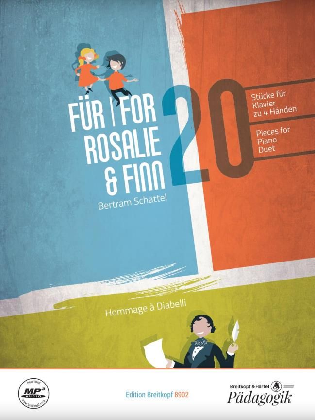 Die Zwillinge Rosalie und Finn auf dem Klavier zu unterrichten, war für den Klavierpädagogen und Komponisten Bertram Schattel Herausforderung und Inspiration zugleich. Angelehnt an die Idee Anton Diabellis, Klavieranfängern Stücke zum Spielen zu geben, die nicht nur sofort gut zu bewältigen sind, sondern dazu noch gut klingen, erfand Schattel 20 kleine, abwechslungsreiche Stücke im Umfang von fünf Tönen für vier Hände. Die pianistischen Herausforderungen sind für beide Spieler durchgehend ähnlich gestaltet. Da 'Kleines Tränenlied' hingegen musikalisch ganz anders klingt als 'Immer schön cool!' oder 'Tango unter der Sonne', ist das Spielheft zugleich eine launige Einführung in verschiedene Ton- und Taktarten, Stile und Spielweisen.