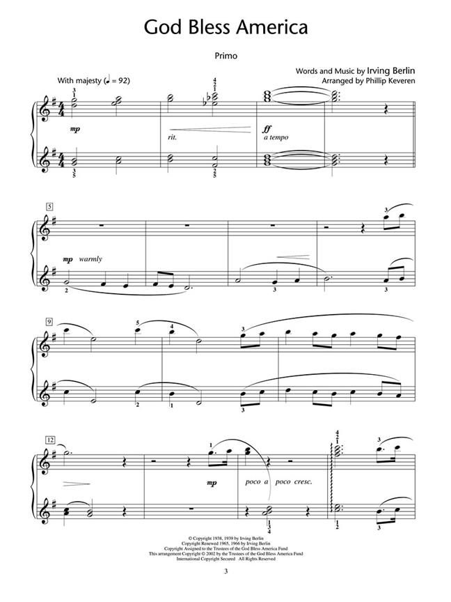Features six star-spangled hits expertly arranged for piano duet, including: America, The Beautiful - Battle Hymn of the Republic - God Bless America - The Star Spangled Banner - Stars and Stripes Forever - You're a Grand Old Flag. As an added bonus, we've included histories and lyrics for each song as well.