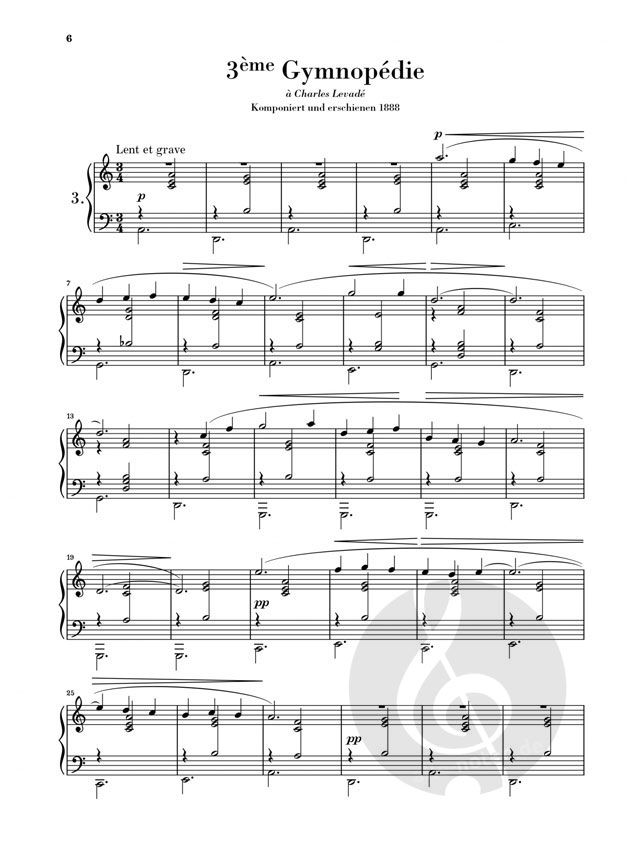 Als eigenwilliger Kopf und verschrobener Individualist distanzierte sich Satie bewusst von den romantischen Traditionen des 19. Jahrhunderts. Die drei Klavierminiaturen 'Gymnopédies' sind erste Zeugnisse seiner Idee einer 'Neuen Einfachheit': wiederkehrende gleichförmige Rhythmen, antiken Kulttänzen nachempfunden, erzeugen einen ganz eigenen, meditativen Reiz. Saties Prinzip, musikalische Bausteine aneinanderzureihen, statt sie einer zielgerichteten Entwicklung zu unterwerfen, sollte wegweisend für manche Strömungen in der Musik des 20. Jahrhunderts werden. An dem ausgewogenen Druckbild unserer Urtextausgabe hätte Satie, der seine Notenblätter gerne kalligraphisch gestaltete, sicher seine Freude.