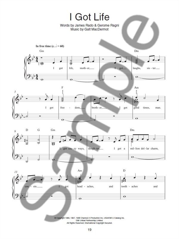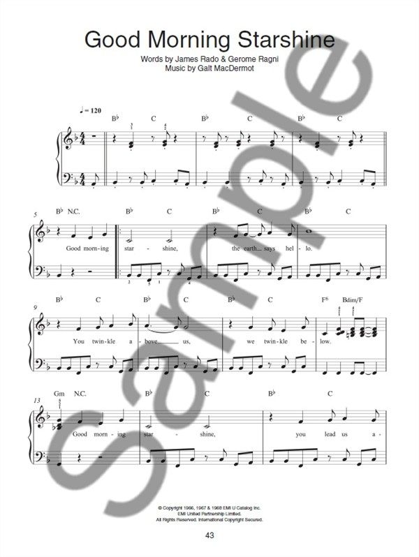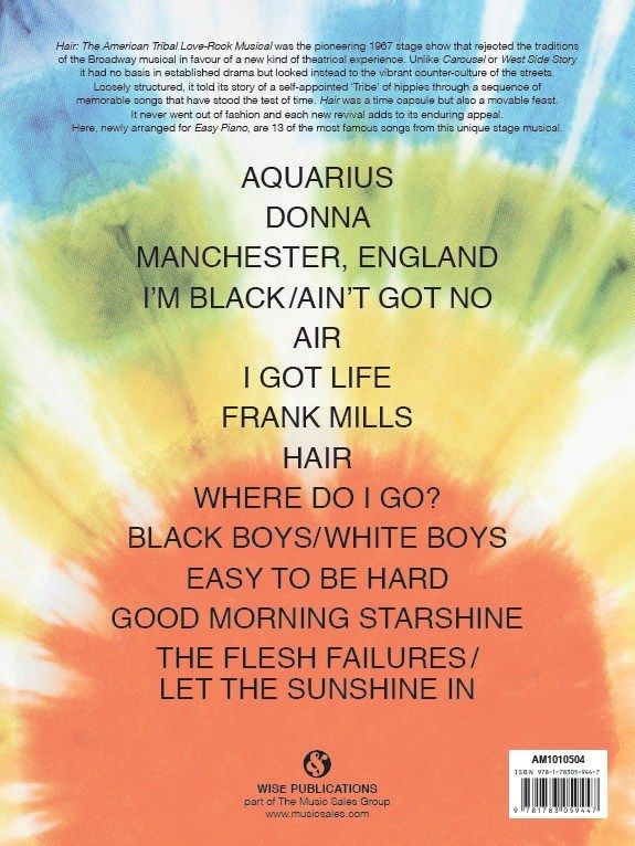 Thirteen of the most famous and popular songs from one of the most unique stage musicals ever produced are arranged here for Easy Piano. If you're just starting out on the Piano, but you still want to learn these great songs, this book is for you. Rejecting all tropes and traditions of Broadway musicals, Hair, which premiered in 1967, offered both an antidote and something new, surprising and shocking. Hair: The American Tribal Love-Rock Musical took the counter-culture of the late 1960s and transformed it into the musical medium, featuring profanity, nudity, drug use and songs that would become anti-Vietnam War protest tunes. The musical was never just a product of its time though, as its enduring appeal has proven. Thirteen of its most popular songs, many of which remain well-loved today, are included in this songbook arranged for Easy Piano. The simplified arrangements feature some guidance on fingering, as well as full lyrics and chord symbols. Songs like the show-opener Aquarius, with its inspiring message, and Ain't Got No, with its rejection of materialism, are included here, their fun lyrics and fantastic music making them sure-fire hits with any audience. Other popular songs like I Got Life, Where Do I Go?, Let The Sunshine In and Good Morning Starshine tell the story not just of the characters in the musical, but of universal themes of life that are common to us all. The 'Tribe' that are featured in the story are a group of counter-culture hippies whose story invoked laughter and sadness along with an empathy that has ensured the show's success even today. Featuring fantastic lyrics and story by James Rado and Gerome Ragni, as well as music by Galt MacDermot, each song in this Hair sheet music songbook is a joy to perform. You will love learning each note of the inspiring and uplifting tunes as well as every word of the touching and memorable lyrics. The success of the once-controversial musical is revealed by its numerous revivals, spanning almost half a century. Songs like Donna, I'm Black and Hair are as relevant now as they were then, making this songbook unique among other musicals for having songs that are both brilliant musically as well as being a mirror into our own world. If you're a fan of musicals in general, Hair in particular, or just great music inspired by the counter-culture revolution of the late '60s, then this songbook is definitely for you. Featuring songs that truly have stood the test of time arranged for Easy Piano, soon you'll be playing these tunes of hope, optimism and love no matter what age or ability you are. After all, isn't that in the spirit of the musical itself?