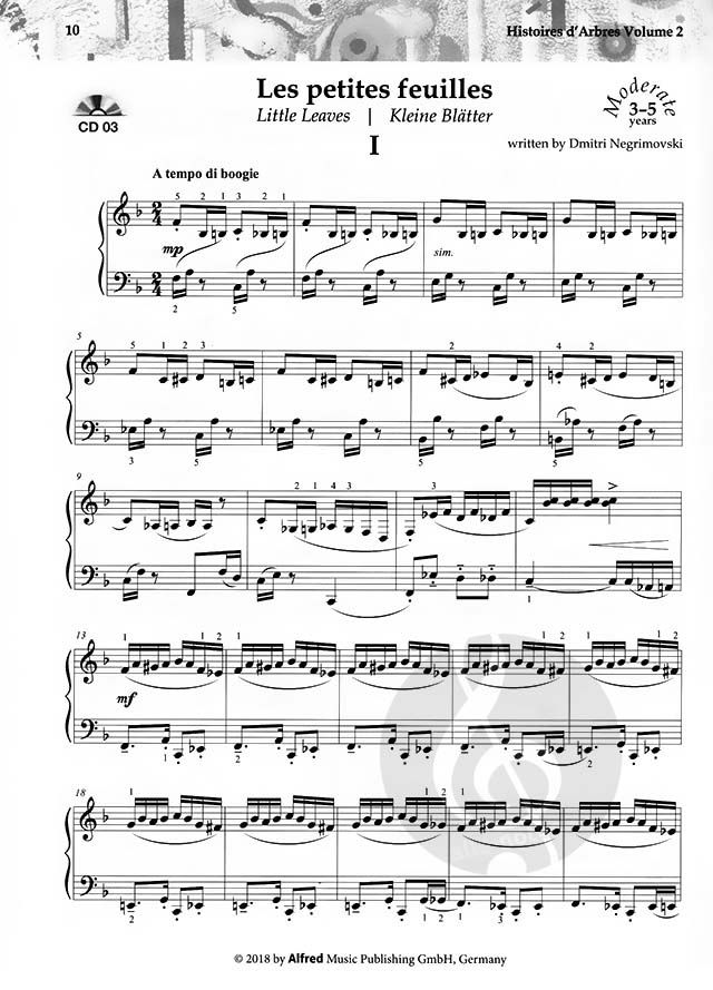 'Histoires d'Arbres - Geschichten der Bäume', das sind poetisch-pittoreske Pianostücke, die die Vorstellungskraft junger Klavierschüler ansprechen und dabei helfen sollen, spieltechnische Hürden leichter zu überwinden. Sie erzählen vom Rascheln der Blätter, den kleinen Zweigen, dem wiegenden Rauschen der Baumkronen, von Insekten, Lianen und Affen bis hin zum Prasseln des Regens und donnerndem Gewitter. Diese Vortragsstücke sind gedacht für MusikschülerInnen, die bereits seit einem Jahr bis zu acht Jahren Klavierunterricht haben und können diese über die Jahre immer wieder begleiten. Dieser Zyklus kann auch als Gesamtwerk vorgetragen werden, zum Beispiel in Form eines Klassenkonzertes. Es ermöglicht die Integration der PianoschülerInnen unterschiedlichen Lernfortschrittes in ein gemeinsames Projekt. Komponiert und zusammengestellt hat diesen Zyklus der in Frankreich lebende Klavierpädagoge und -komponist Dmitri Negrimovski, der auch die Einspielungen für die beiliegende CD selbst vorgenommen hat. Nach Band 1 mit 21 Spielstücken folgt nun Band 2 mit 16 weiteren Spielstücken.