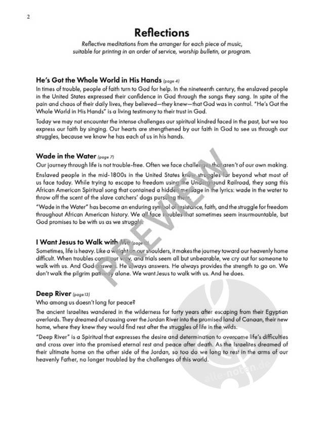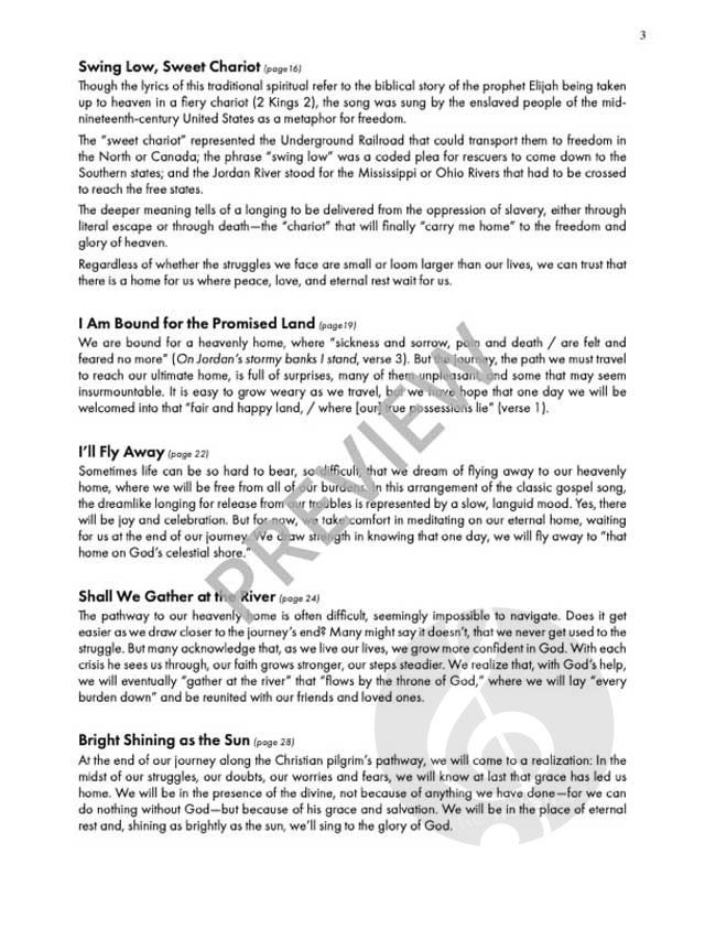 Homeward Bound ist eine Sammlung von Meditationen zu neun traditionellen Spirituals und Gospelsongs über unsere Reise in den Himmel. Den Stücken sind kurze Meditationen vorangestellt, die sich zum Abdruck in der Gottesdienstordnung eignen oder vom Pianisten zur persönlichen Inspiration gelesen werden können. Außerdem folgen auf jede Meditation Aufführungshinweise zu dem Arrangement. Inklusive Titel- und Melodienverzeichnis.