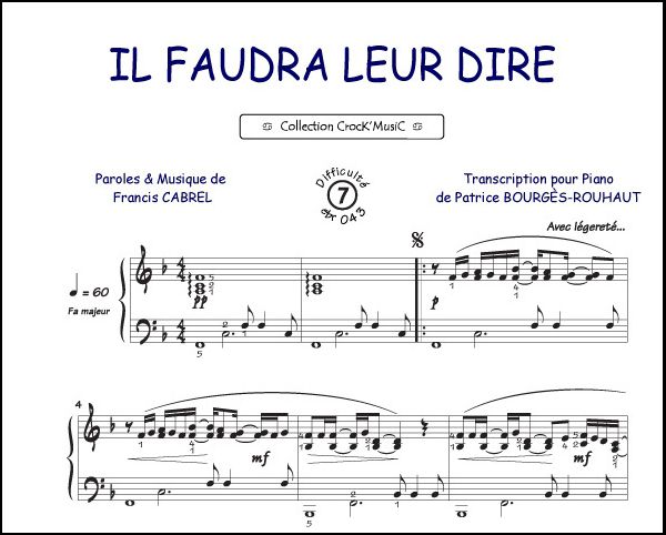 Diese Partitur stammt aus der Sammlung CrocK'MusiC, die aus Transkriptionen französischer Lieder für das Klavier besteht, begleitet von ihren Texten.