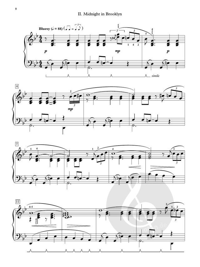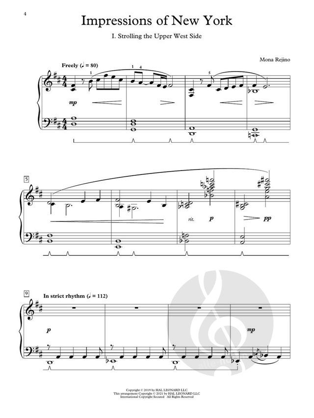 Mona Rejino has written a cool jazz sonatina that depicts the sights and sounds of one of the most-loved cities in the world. Rejino puts into music the sophisticated feel of strolling down a tree-lined street, midnight in a Brooklyn jazz club, and the experience of seeing the famed frenetic Grand Central Station for the first time. Highly recommended!