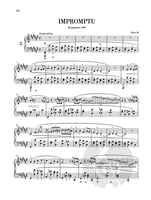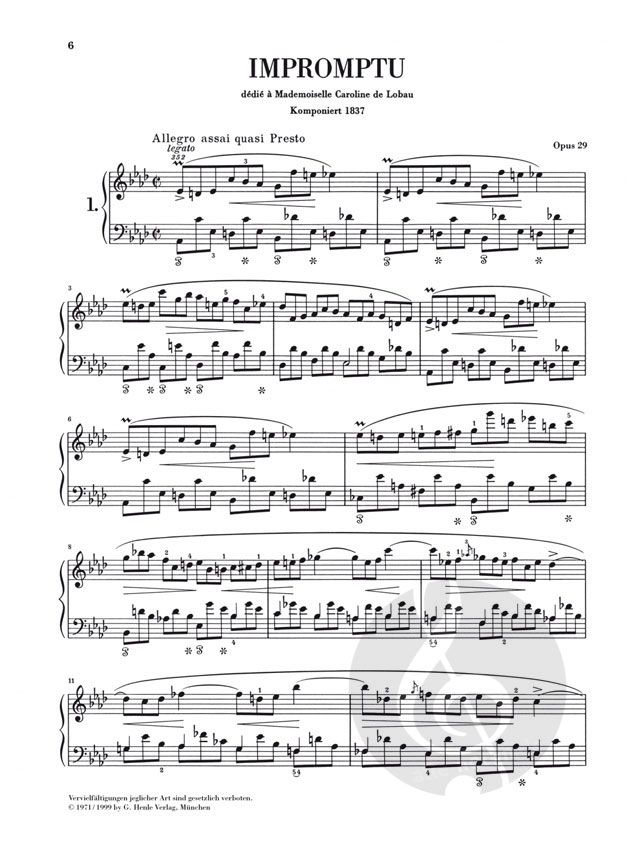 Chopins vier Impromptus haben, typisch für diese von Franz Schubert kreierte Gattung, sehr stark improvisatorischen Charakter, sind jedoch stets voll spielerischer Eleganz und Leichtig-keit. Das gilt vor allem für die drei ersten Stücke dieses Bandes, Op. 29, 36 und 51. Während das erste wohl 1837 entstand, komponierte Chopin die zwei anderen während der Zeit seiner Beziehung mit der Schriftstellerin George Sand auf deren Landsitz Nohant, Op. 36 im Jahre 1839, Op. 51 drei Jahre später. Die Opuszahl des Fantaisie-Impromptu, op. 66, ist irreführend, denn das Stück war bereits 1834 als erstes der vier Werke entstanden. Chopin hatte es offensichtlich nicht für eine Drucklegung vorgesehen. Erst nach seinem Tod veranlasste sein Freund Julian Fontana eine Veröffentlichung. Der Druck weicht allerdings so stark von dem glückli-cherweise noch erhaltenen Autograph ab, dass in der Henle-Urtextausgabe beide Versionen wiedergegeben wurden.