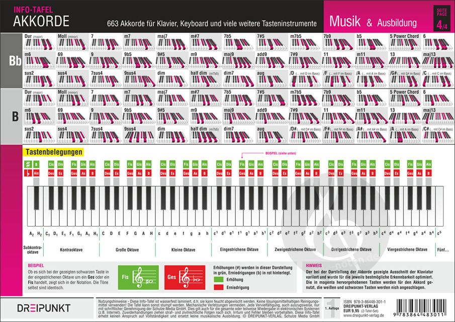 Auf vielfachen Wunsch unserer Kunden haben wir eine Übersicht aller im normalen Spielbetrieb vorkommenden Akkorde erstellt. Jeder, der das Klavierspiel (oder das Spielen auf einem anderen Tasteninstrument) erlernt, benötigt eine verlässliche und gut erkennbare Darstellung von Akkorden. Hier finden sowohl der Spielanfänger, als auch der Fortgeschrittene eine Auflistung mit Griffbildern von 39 verschiedenen Akkorden für alle 17 möglichen Grundtöne - insgesamt 663 Akkorde. Schnell - übersichtlich - haltbar.