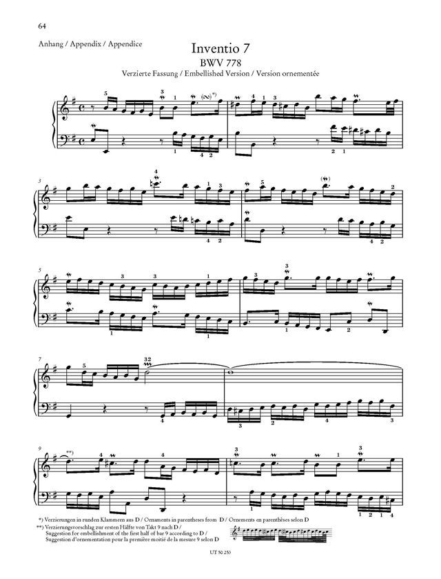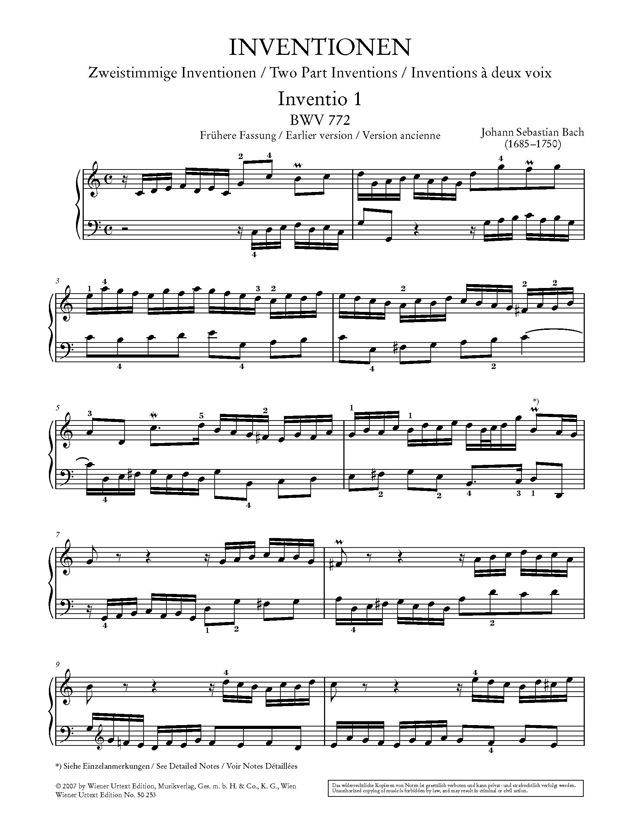 Johann Sebastian Bachs Inventionen und Sinfonien, besser geläufig als die zwei- und dreistimmigen Inventionen, waren schon im Klavierunterricht des Komponisten ein fester Bestandteil der Studienliteratur. Sie sind es bis heute geblieben. Kein Klavierschüler kommt an ihnen vorbei, gelten ihre grundlegenden Ansprüche, nämlich reine spielen zu lernen und eine cantable Art im Spielen zu erlangen, doch nach wie vor. Die Neuausgabe der Wiener Urtext Edition folgt konsequent Bachs autographer Reinschrift. Verzierte Versionen aus Abschriften von Bachs Schülern, die einen Einblick in Bachs Verzierungspraxis gewähren, sind separat abgedruckt; eine Vermischung der Fassungen wurde bewusst vermieden. Zur Auflösung der Ornamentzeichen der Sinfonia Nr. 5 wurde ein exemplarischer Vorschlag mitgeteilt. Über weitere Aspekte zur Aufführungspraxis, die z.T. auf eigenhändige Eintragungen Bachs in den Schüler-Abschriften zurückgehen, informieren Interpretationshinweise und Anmerkungen. Sie verstehen sich als Anregungen zum Studium von Werken, deren definitive Klanggestalt nicht in allen Einzelheiten festgelegt war und die damit der pädagogischen Fantasie ein weites Spektrum kreativer Möglichkeiten eröffnen.