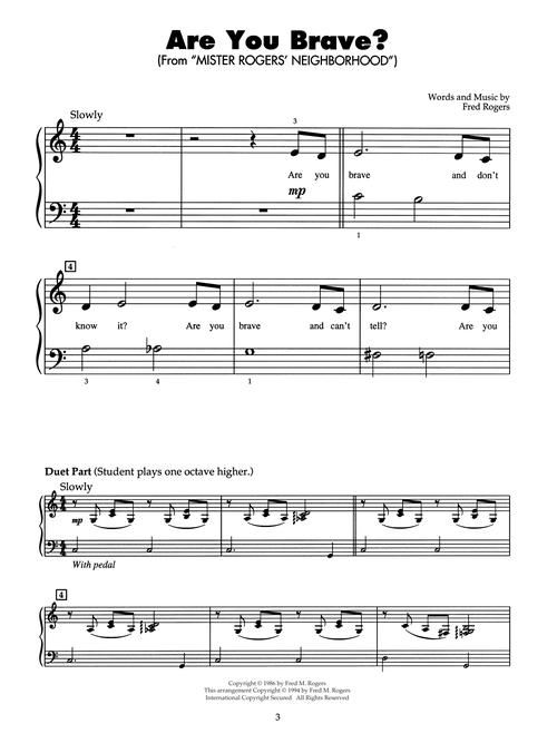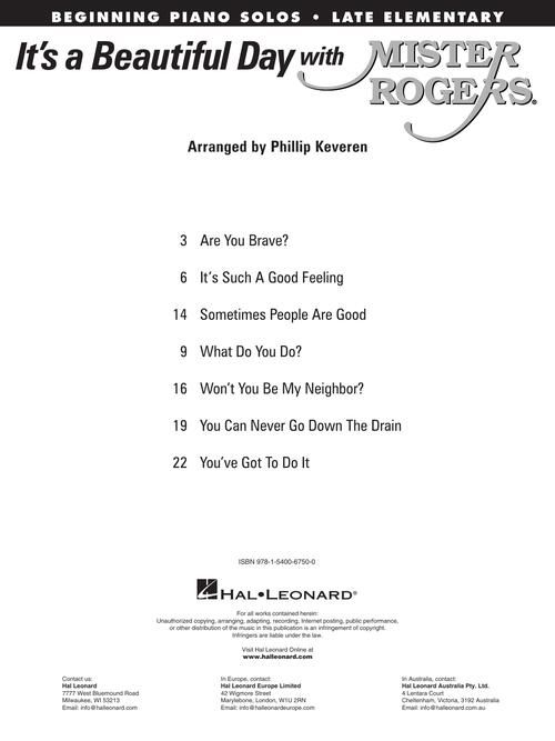 Now back in stock! The iconic television show and music from Mister Rogers Neighborhood is back in the spotlight with the November 2019 release of the A Beautiful Day in the Neighborhood movie starring Tom Hanks. This songbook includes 7 Phillip Keveren arrangements from the popular children's show: Are You Brave? - It's Such a Good Feeling - Sometimes People Are Good - What Do You Do? - Won't You Be My Neighbor? (It's a Beautiful Day in the Neighborhood) - You Can Never Go down the Drain - You've Got to Do It.