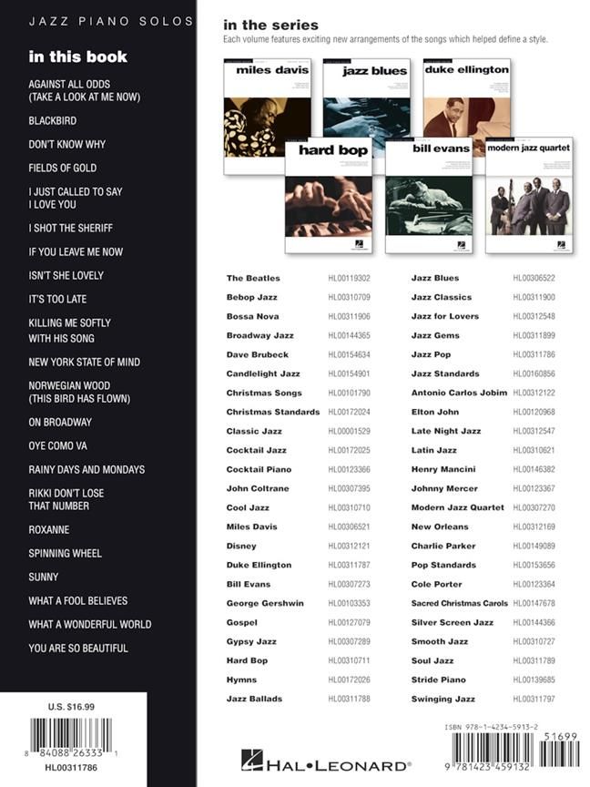 Jazz piano arrangements of 22 classic pop songs, including: Blackbird - Don't Know Why - Fields of Gold - Isn't She Lovely - It's Too Late - New York State of Mind - On Broadway - Oye Como Va - Roxanne - What a Fool Believes - You Are So Beautiful - and more.