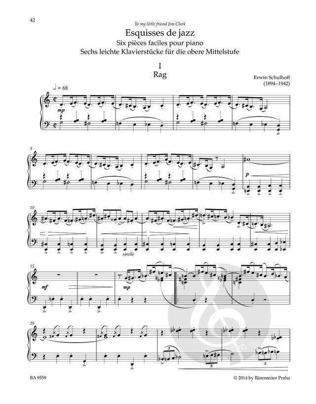 Der vorliegende Band mit fünf seiner Zyklen für Klavier beinhaltet 35 einfachere ('Esquisses de jazz', 1927) bis anspruchsvollere ('Cinq études de jazz', 1926) vom Jazz inspirierte Stücke. Diese erste Urtext-Ausgabe erstellte Michael Kube auf Basis der originalen Drucke im Vergleich mit den erhaltenen handschriftlichen Quellen, wobei Fehler beseitigt sowie die spezifischen Züge der Notation Schulhoffs beibehalten wurden.