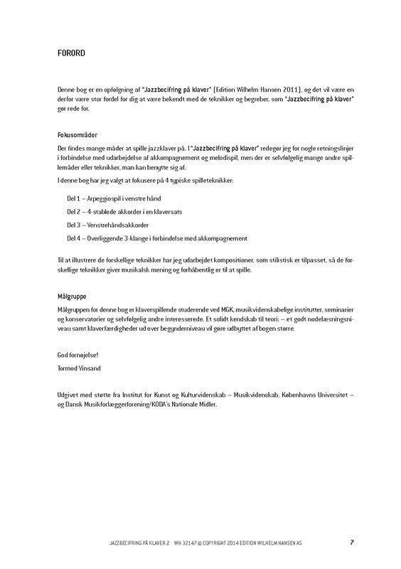 Jazzbecifring på klaver 2 af Tormod Vinsand. Denne bog er en opfolgning på 'Jazzbecifring på klaver' (Edition Wilhelm Hansen 2011), og det vil derfor være en stor fordel for dig at være bekendt med de teknikker og begreber, som 'Jazzbecifring på klaver' gor rede for. Der findes mange måder at spille jazzklaver på. I Jazzbecifring på klaver redegor jeg for nogle retningslinjer i forbindelse med udarbejdelse af akkompagnement og melodispil, men der er selvfolgelig mange andre spillemåder eller teknikker, man kan benytte sig af. Jazzbecifring på klaver - 2 fokuserer på fire typiske spilleteknikker: Del 1 - Arpeggiospil Del 2 - 4-stablede akkorder i en klaversats Del 3 - Venstrehåndsakkorder Del 4 - Overliggende 3-klange i forbindelse med akkompagnement