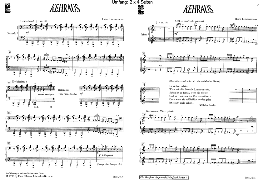 Capriccio für Klavierfür der Hände vier.Und dann zum guten TonGeräusche: Percussion.Dieses Klavierstück eignet sich besonders als Schlussstück eines Programms. Links vom Secondo-Spieler und rechts vom Primo-Spieler wird ein Schlagwerk aufgestellt, am besten Bongos und Congas. Die Percussion wird mit von den Pianisten mit übernommen. )