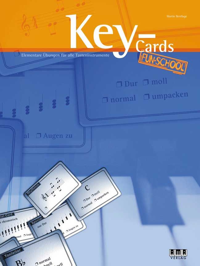 Elementare Übungen für alle Tasteninstrumente - Kartenspiel. Die Karten beinhalten Durtonleitern (C, D, E, F, G, A, B, Bb, Eb, Ab), Dreiklangsakkorde mit Umkehrungen (C, D, E, F, G, A, B - sowohl Dur als auch Moll), Rhytmus-Pattern mit Vierteln und Achteln zum Klopfen oder als Vorbereitung zur Songbegleitung und Griffwechsel für die Hauptakkorde (in den Durtonarten C, G, D, A, E, F, Bb) - Themen, die in jeder Tastenschule vorkommen, vermittelt die Grundkenntnisse die man zum Erlernen der Spielstücke und zur Improvisation benötigt. Darum sollte 'Key-Cards' parallel zum 'herkömmlichen' Unterrichtsbuch verwendet werden, um praktisch ganz 'nebenbei' die Fertigkeiten schon viel weitgehender zu entwickeln als dies normalerweise der Fall wäre.