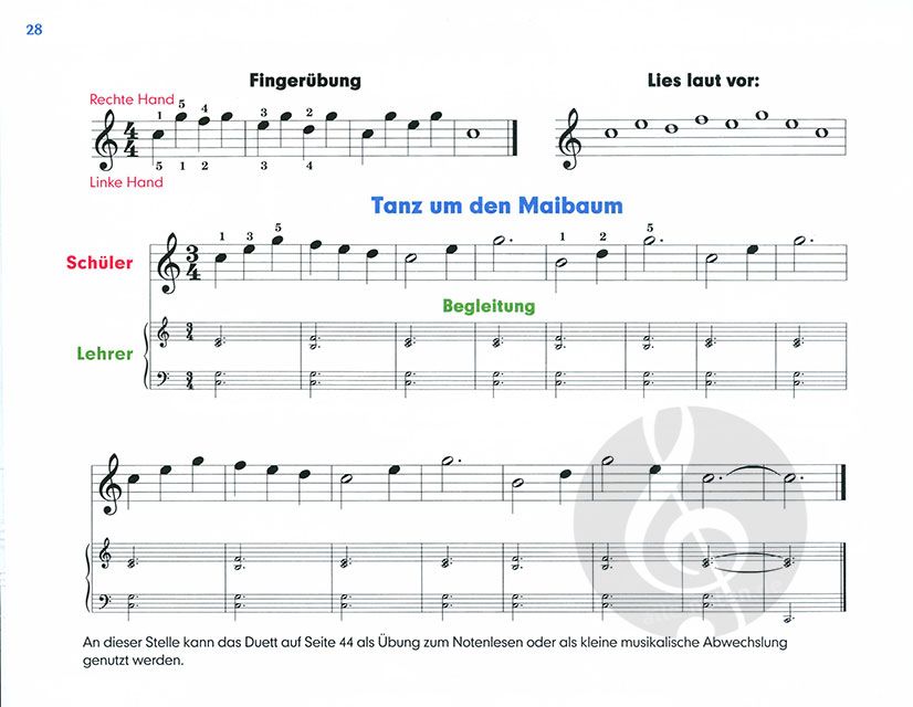 Die Stücke sind so konzipiert, dass nur jeweils eine Hand benötigt und somit die Spielsicherheit gefestigt wird, ehe das zweistimmige Spiel beginnt. Schreib- und Hausaufgaben runden diese Klavierschule ab. Klavierspielen mit Spaß und kinderleicht!