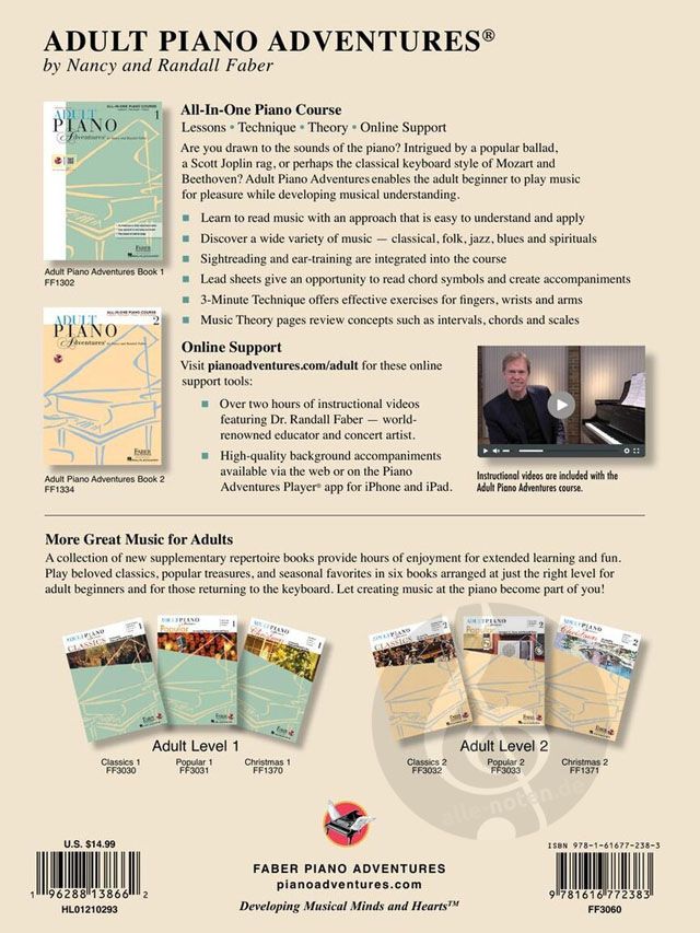 !Adult Piano Adventures Disney Book 1! offers a bounty of beloved classic and current Disney hits for beginning adult learners. Check out 29 favorites from The Little Mermaid, Aladdin, Beauty and the Beast, Coco, Frozen, The Lion King, Mary Poppins, and so many more. The easy, tuneful arrangements span the skillset of the Adult Piano Adventures Course Book 1, or can function as an ideal review for those in Book 2. Optional teacher duets provide rich harmony and rhythmic support. With focus on the keys of C and G major and I, IV, and V7 chords, the adult learner can enjoy a treasury of Disney's most famous songs.