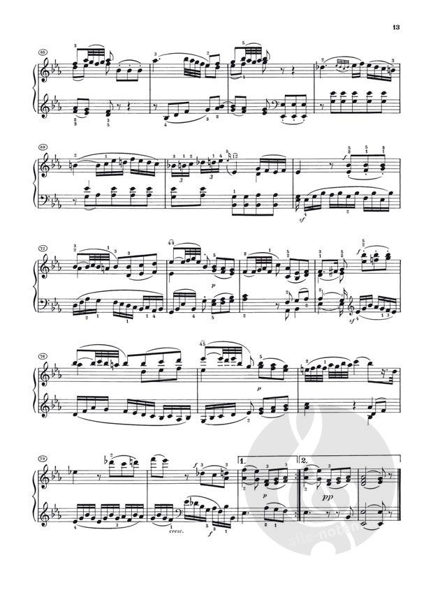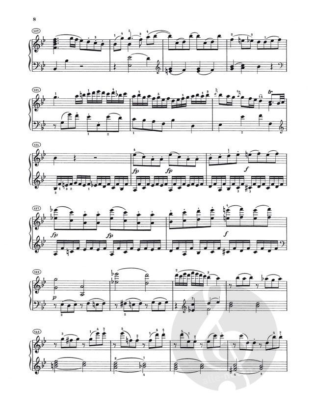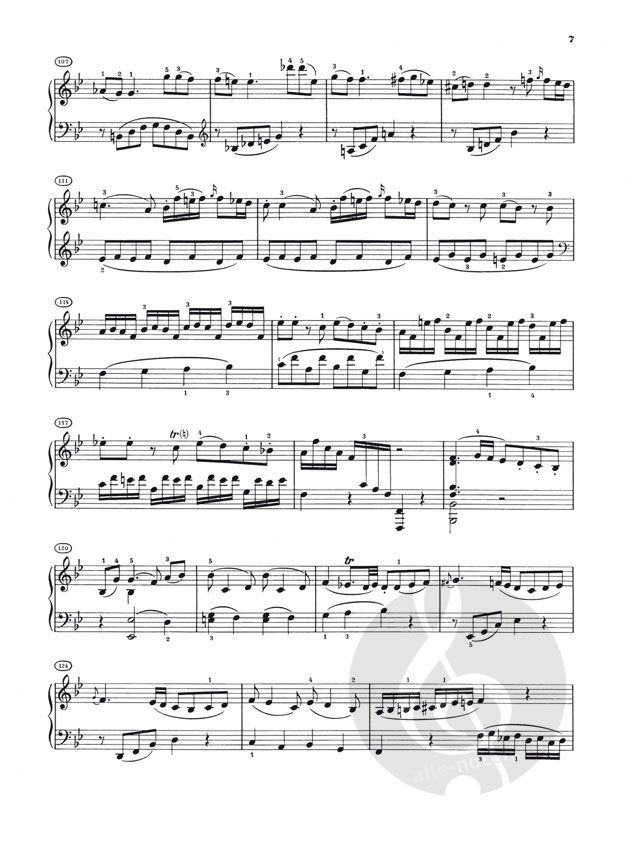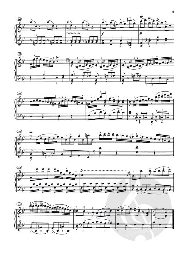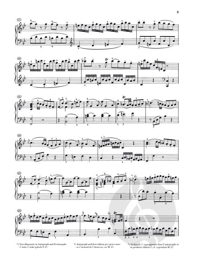 Diese Sonate führt uns erneut in lyrische Bereiche, wie schon durch die Wahl der Tonart B-Dur angedeutet wird. Der erste Satz beginnt mit einer wunderbar kantablen Themengruppe, wie sie nur Mozart schreiben konnte. Es ist bemerkenswert, dass der dritte und vierte Takt des Themas eine variierte Sequenzierung der beiden Anfangstakte darstellt. Ein italienischer Zeitgenosse oder auch Johann Christian Bach (in vieler Hinsicht ein Vorbild für den junge Mozart) hätte wohl einfach den Anfang wörtlich eine Stufe tiefer wiederholt - es hätte immer noch gut geklungen. Durch Mozarts Variierung und durch den unglaublichen Reichtum an nachfolgenden melodischen Einfällen entsteht erst dieses Wunder eines Satzes, der zu den schönsten Sonaten der Klavierliteratur zählt. Wie einfach erscheint im Verhältnis dazu die streng strukturierte Beethoven-Sonate op. 22 in der gleichen Tonart und etwa den gleichen Dimensionen! Beethoven konstruierte seinen ersten Satz aus nur wenigen Motiven, während bei Mozart mindestens zehn verschiedene motivische Einfälle allein schon in der Exposition nachweisbar sind, die aber so organisch ineinander fließen, dass die 'große Linie' nie abreißt. Dieses scheinbar mühelose Dahinfließen nimmt in mancher Hinsicht Schuberts Melodiefülle und seine 'himmlische Länge' vorweg.