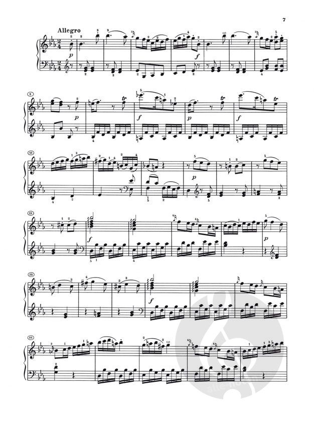 Diese Sonate fällt dadurch auf, dass sie - ebenso wie KV 331 - nicht mit einem lebhaften oder schnellen Satz beginnt, immerhin allerdings anders als die A-Dur-Sonate mit einem Satz in Sonatenform, einem lyrischen Adagio, das mit einem ausdrucksvollen dreitaktigen Thema in polyphon geführtem dreistimmigen Satz anfängt. Dieser Gedanke fehlt in der Reprise und kehrt erst in der Coda wieder. Der 'Themen'-Nachsatz ist ein zwar andersgearteter, aber ebenfalls melodiöser Gedanke, der zweimal auf verschiedenen Stufen wiederholt wird und danach zu einem Halbschluss auf der Dominante führt. Ein graziöses 'Seitenthema' (wenn man es so nennen will) setzt in Takt 9 ein. Es ist eigentlich nur ein zweiteiliges Motiv, das wiederholt wird, um unmerklich in die Schlussgruppe zu gleiten. Die kurze Durchführung beginnt mit dem abgewandelten Kopfmotiv und einem spannungsgeladenen Sekundakkord, dem zwei dramatisch wirksame kurze Crescendo-Steigerungen folgen. Trotz seiner kleinen Dimensionen ist dieser Satz ein echtes, meisterhaftes Mozart'sches Stück, formvollendet und ausdrucksvoll. Mozart hat ihn selbst auch ungewöhnlich sorgfältig mit Artikulationszeichen und dynamischen Hinweisen versehen, die natürlich Beachtung verdienen, wobei allerdings nicht vergessen werden darf, dass die Lautstärke dem zur graziösen Rokoko-Zeit üblichen Rahmen angepasst werden sollte.