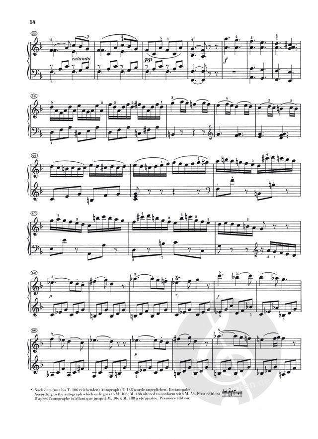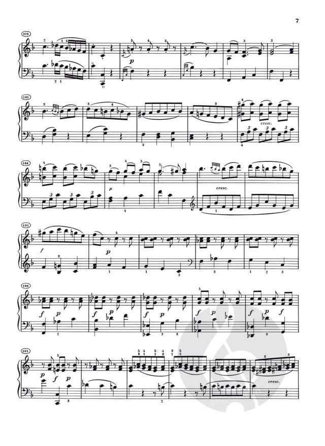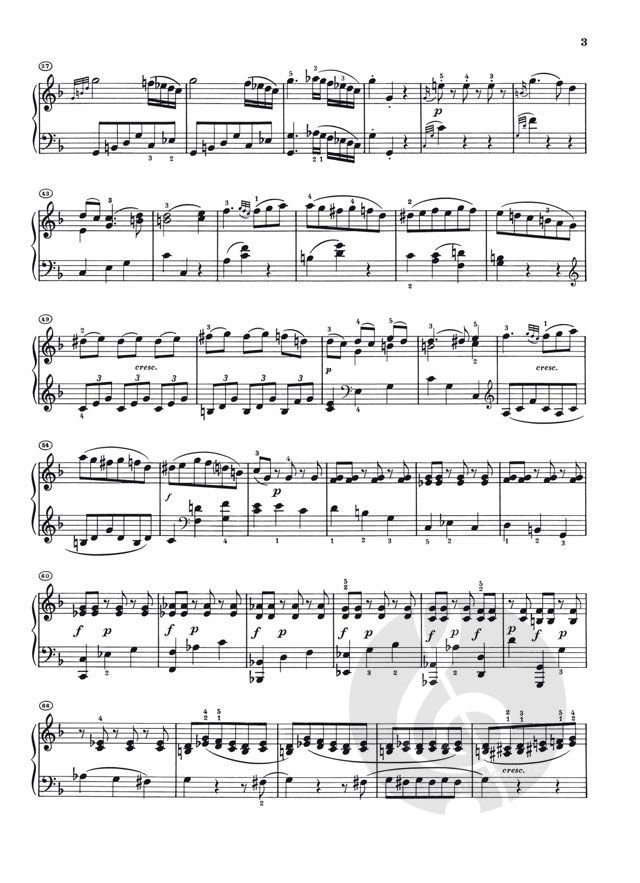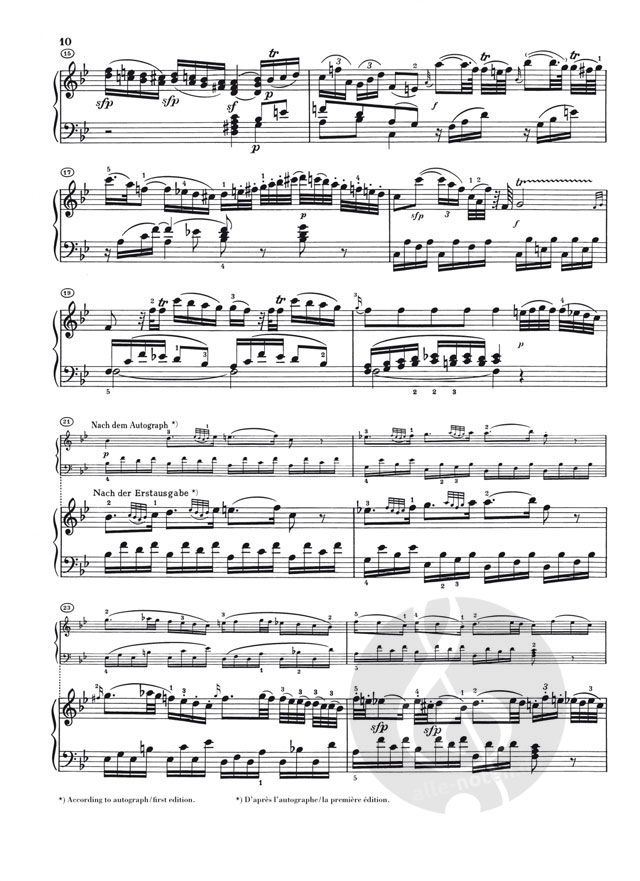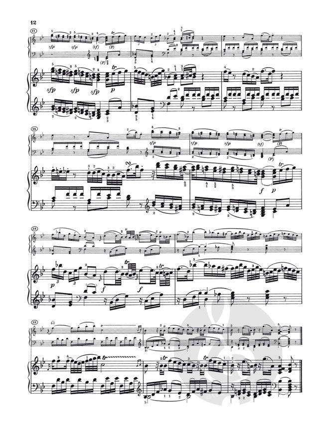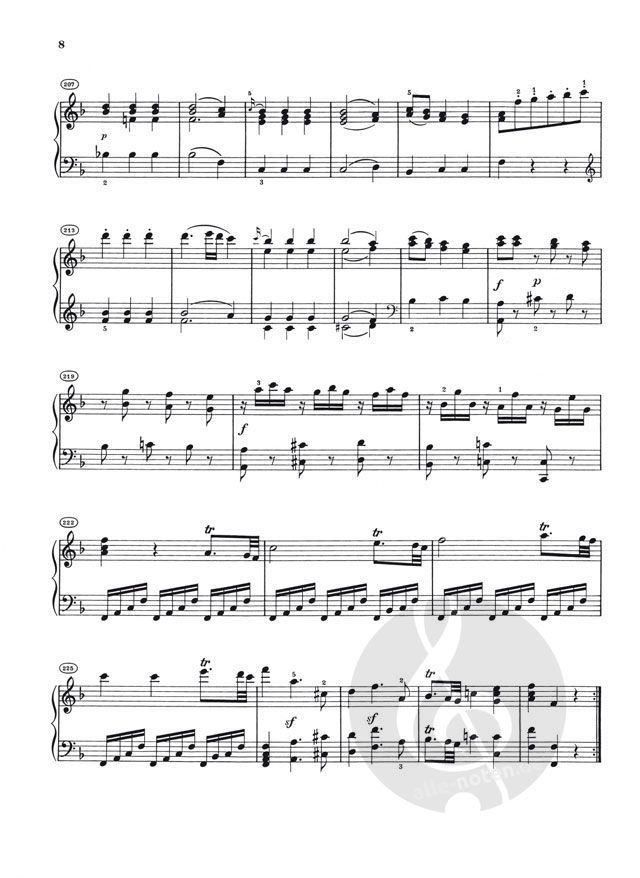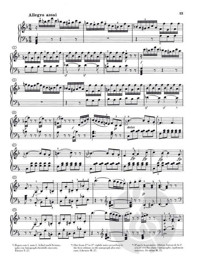 Die F-Dur-Sonate KV 332 beginnt ähnlich wie die F-Dur-Sonate KV 280 im Dreivierteltakt. Das kantable Anfangs-Thema dehnt sich im Nachsatz ungewohnt aus und wird von einer Fülle melodiöser Gedanken gefolgt, von denen manche an Haydn erinnern (Takt 13 ff.). An diesem Satz lässt sich wieder einmal keine Lehrbuch-Analyse demonstrieren, obwohl die Hauptmerkmale der Sonatenform wie die Dreiteilung in Exposition, Durchführung und Reprise natürlich vorhanden sind und auch der Tonarten-Plan annähernd zutrifft - sieht man von der stürmischen d-Moll-Passage und der Modulation nach c-Moll vor dem Eintritt des 'Seitenthemas' im regulären C-Dur ab. Aber eine Fülle origineller Einfälle, wie die Hemiolen-Bildung in Takt 64/65, der Beginn der Durchführung mit einem neuen thematischen Gedanken, etc., zeugen von Mozarts Freiheit in der Anwendung der Sonatenform.