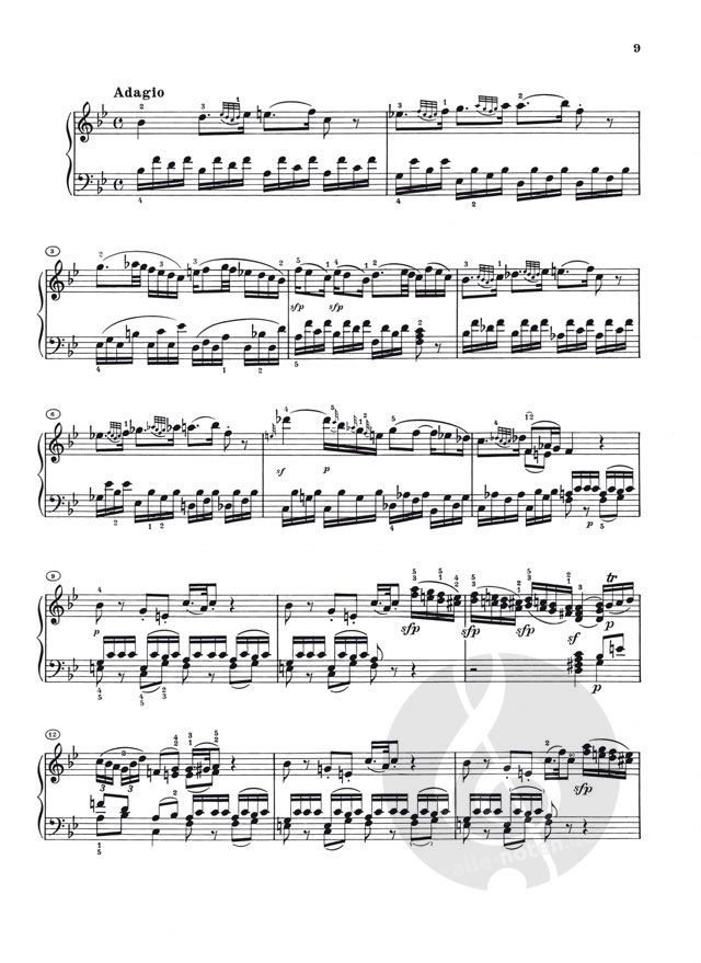 Im darauffolgenden Adagio in B-Dur zeigt sich Mozarts Kunst im Variieren der Wiederholungen. Wie so oft hat er gerade bei solchen Sätzen noch kurz vor der Drucklegung einige ornamentale Bereicherungen angebracht. Eine zweimalige dramatische Moll-Wendung bringt eine ernste, fast tragische Note in diesen sonst eher idyllischen Satz.