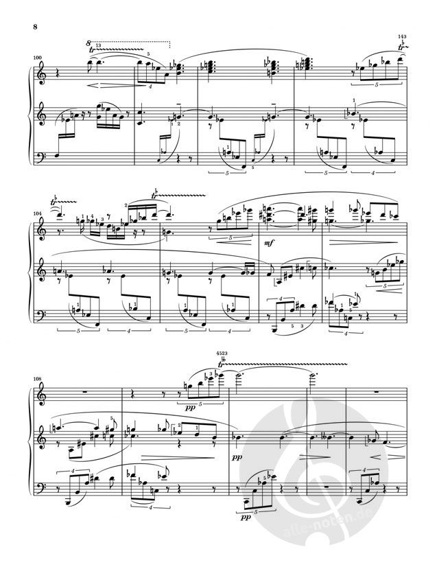 Es war eine erhabene und große Idee, die Skrjabin in seinen letzten Lebensjahren erfüllte: Angeregt vom Studium theosophischer Schriften träumte er davon, Musik, Dichtkunst, Mimik, Architektur, Licht, Farbe und sogar Düfte zu einem Gesamtkunstwerk zu vereinen und den Menschen damit auf eine höhere Bewusstseinsstufe zu heben. Jenes 'Mysterium' genannte Werk wurde nie vollendet, doch seine späten Klaviersonaten - als Vorstufe gedacht - lassen spürbar werden, was Skrjabin bewegte. An seiner achten Sonate arbeitete er besonders lange und las intensiv Korrektur; dennoch schlichen sich später manche Verfälschungen ein. Anhand von Autograph und Erstausgabe konnten zweifelhafte Stellen nun geklärt und für unsere Urtextausgabe berichtigt werden.