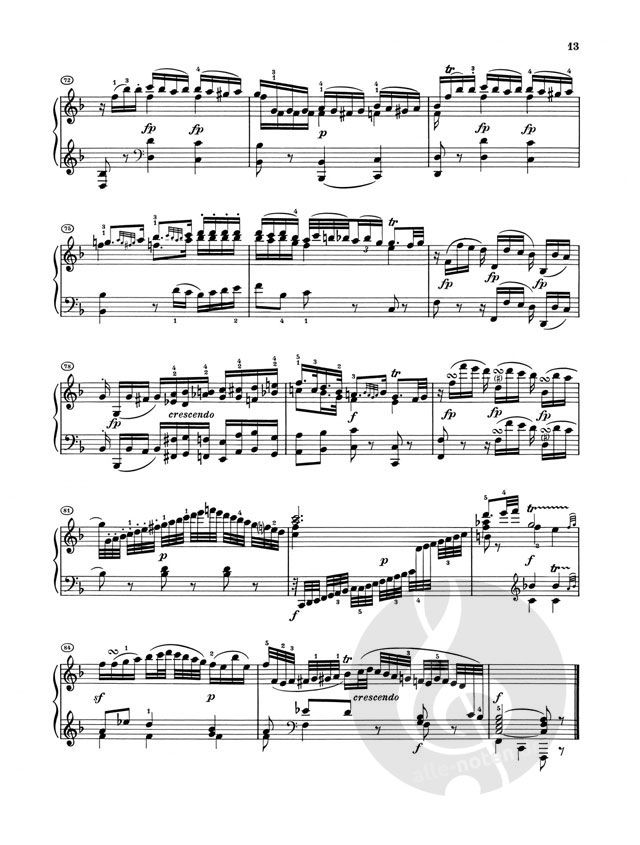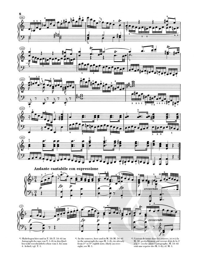 Wunderbar ist dann der milde Trost, das ruhige 'Schreiten der Grazien' im zweiten Satz dieser Sonate, ein Andante cantabile con espressione in F-Dur, das mit Würde zu spielen ist. Trotz einer lyrischen Grundstimmung vermittelt dieser ausdrucksvolle Satz etwas leidenschaftlich-Großartiges und ist somit weit entfernt von der warmen und graziösen Innigkeit anderer Mittelsätze in einer Dur-Tonart. Ein zweites Thema (ab Takt 15) erinnert mit seinen Tonwiederholungen im Aufbau übrigens deutlich an das Seitenthema im zweiten Satz der Symphonie KV 201. Die großartige Steigerung in der Durchführung mit dem Höhepunkt in Takt 43-49 erweckt natürlich Reminiszenzen an die Durchführung des ersten Satzes. Umso schöner ist dann die Rückkehr zum trostreichen Hauptthema und zur Reprise.