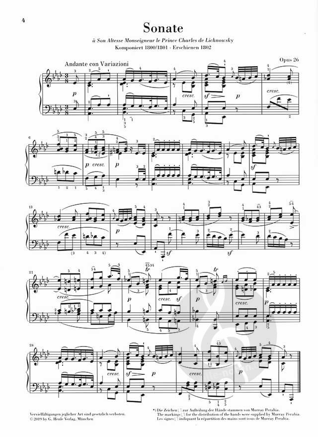 Zum Beethoven-Jahr 2020 legt der G. Henle Verlag den ersten von drei Bänden mit sämtlichen Klaviersonaten Ludwig van Beethovens in einer neuen Urtextausgabe vor, herausgegeben von Maestro Murray Perahia und dem ausgewiesenen Beethoven-Experten des G. Henle Verlags, Norbert Gertsch. Der Band enthält die zwischen 1802 und 1806 erschienenen elf Sonaten Nr. 12 bis 22, op. 26 bis 54. Alle Sonaten sind nach dem aktuellen Forschungsstand ediert und mit ausführlichem Vorwort und Kritischem Bericht versehen, der die Quellenlage und Lesartenprobleme darstellt. Murray Perahia schenkt der Klavierwelt neben seinem höchst wertvollen Fingersatz auch tiefergehende Betrachtungen zur Gefühlswelt und zum strukturellen Aufbau einiger dieser Kompositionen.