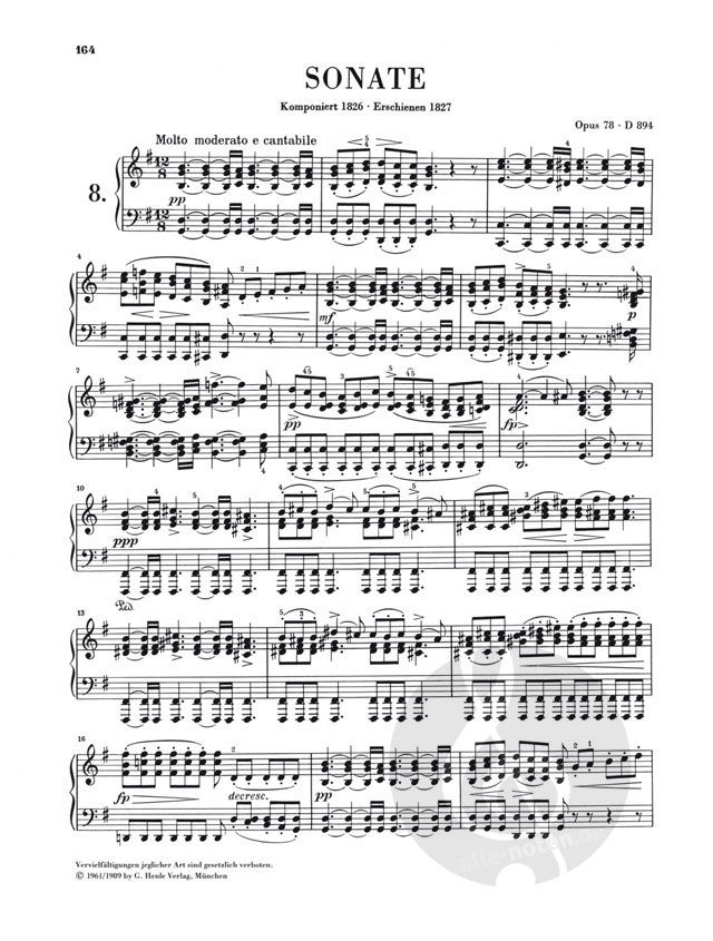 Schuberts 22 Klaviersonaten spiegeln den kompositorischen Weg, den dieser allzu früh verstorbene Komponist gegangen ist, sehr genau wider. Von den ersten Versuchen des Sechzehn- bis Neunzehnjährigen ist eine kontinuierliche Entwicklung festzustellen hin zu den fünf gro-ßen Sonaten, die er in den Jahren zwischen 1823 und 1826 komponierte und schließlich zu den drei kurz vor seinem Tod entstandenen, meisterlichen Sonaten, die ihn als Sonatenkom-ponisten fraglos auf eine Stufe mit Beethoven stellen. Band II der dreibändigen Henle-Urtextausgabe enthält nach der G-dur-Sonate, D 894, op. 78, mit ihrem duftigen Klaviersatz voll zarten Ausdrucks die drei großen Meistersonaten in c-moll, A- und B-dur, mit denen Schubert weit in die Zukunft vorausgreift und die zum klassischen Kanon der Klaviersonaten-Literatur gehören.