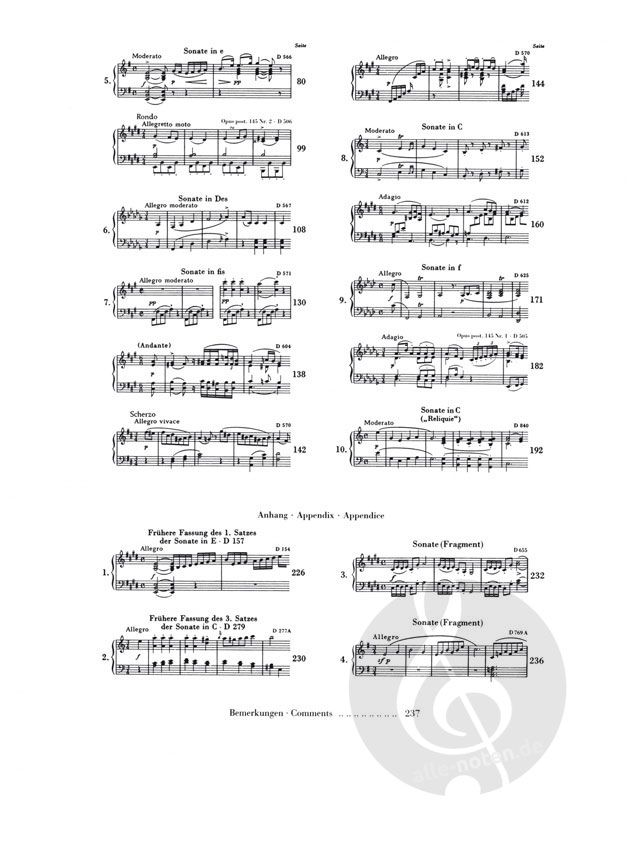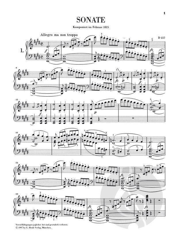 Schuberts 22 Klaviersonaten spiegeln den kompositorischen Weg, den dieser allzu früh verstorbene Komponist gegangen ist, sehr genau wieder. Von den ersten Versuchen des Sech-zehn- bis Neunzehnjährigen ist eine kontinuierliche Entwicklung festzustellen hin zu den fünf großen Sonaten, die er in den Jahren zwischen 1823 und 1826 komponierte und schließlich zu den drei kurz vor seinem Tod entstandenen, meisterlichen Sonaten, die ihn als Sonatenkom-ponisten fraglos auf eine Stufe mit Beethoven stellen. Es gehört zur intensiven Auseinandersetzung Schuberts mit der Gattung, dass er eine große Anzahl von Klaviersonaten unvollendet hinterließ. Band III der dreibändigen Henle-Urtextausgabe enthält daher neben seinen frühen Sonaten aus den Jahren 1815-1818 auch diese Fragmente, die von Paul Badura-Skoda jeweils vollendet wurden. Seine Ergänzungen sind jeweils durch kleineren Notenstich kenntlich gemacht. Der Kritische Bericht im Anhang des Bandes gibt außerdem genaue Auskunft über die Genesis der einzelnen Werke.