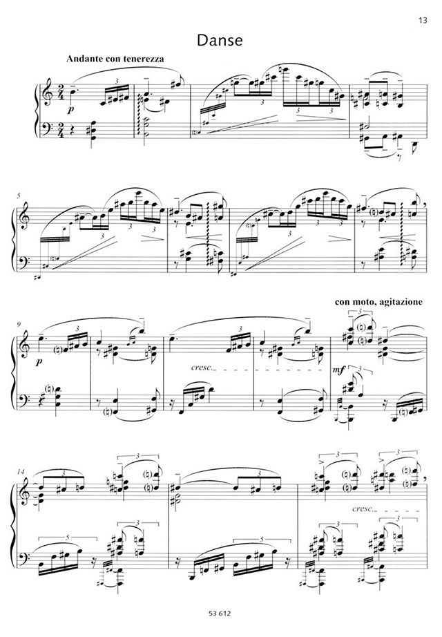 Die sechs Miniaturen 'Berceuse', 'Danse', 'Valse', '2 Préludes' und 'Poème' erinnern in ihrer musikalischen Sprache an Skrjabin, sind aber technisch einfacher zu spielen und können im Klavierunterricht verwendet werden.